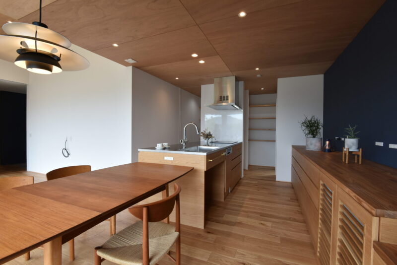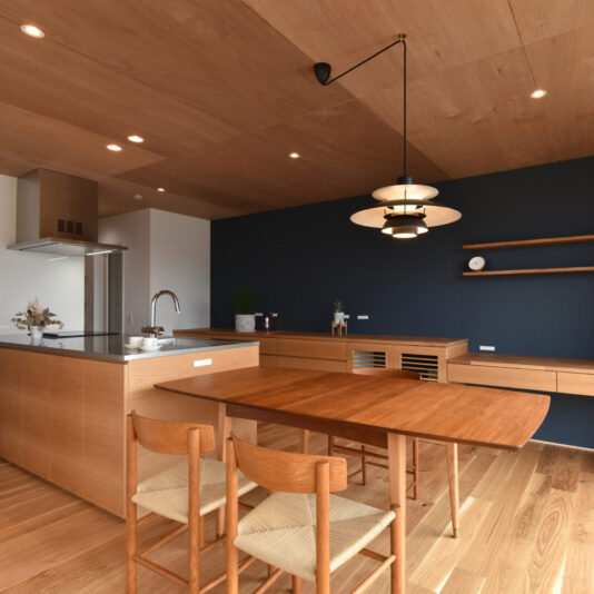 紺色の壁紙が一際目を引くキッチンは、こだわりのオーダーキッチンです。 大きな窓はウッドデッキへ繋がっており、お部屋とお庭の一体感が増します。 収納スペースは動線を考え配置し、将来を見据え1階のみでも生活できるようになっています。