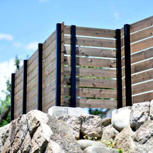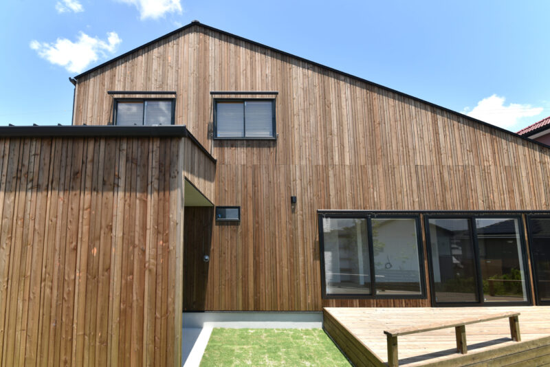 縦張りに仕上げられたカラマツの外壁が、 家をのびのびと大きく見せてくれます。 外装にも内装にもふんだんに木を使用した、温もりのある家。