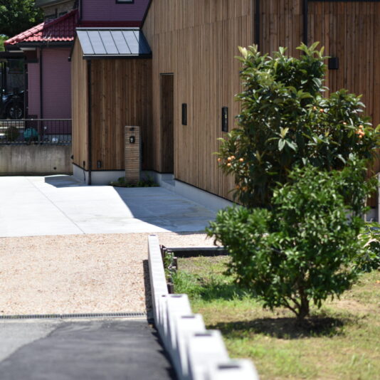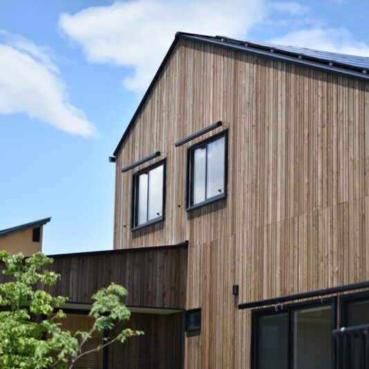 寒い冬でも猫とフローリングでゴロンとくつろぐ、温もりのある家。 時と共に変化していく板張りの外壁と、 まっさらなR垂れ壁の曲線が、どこか優しい印象を与えます。