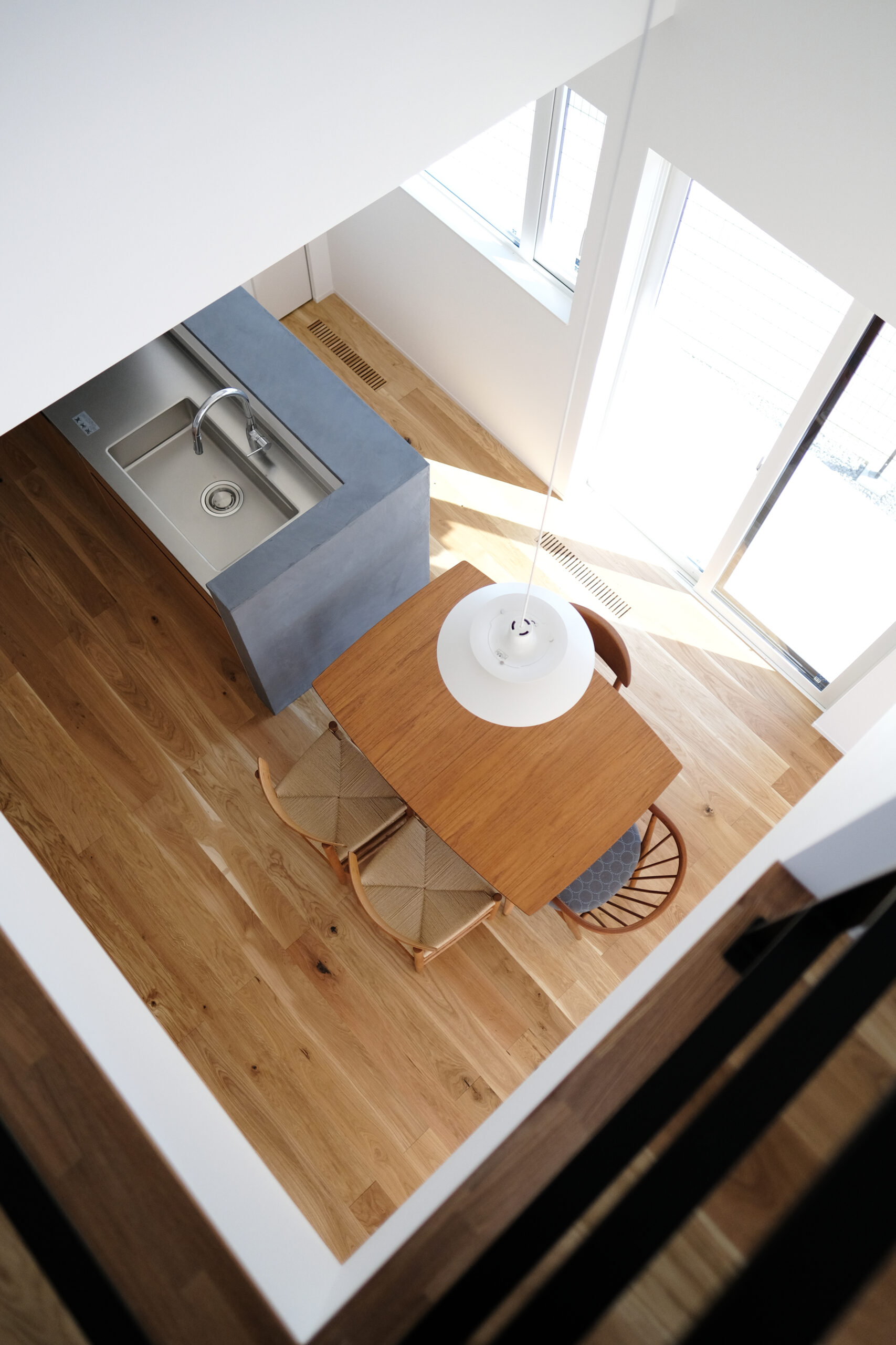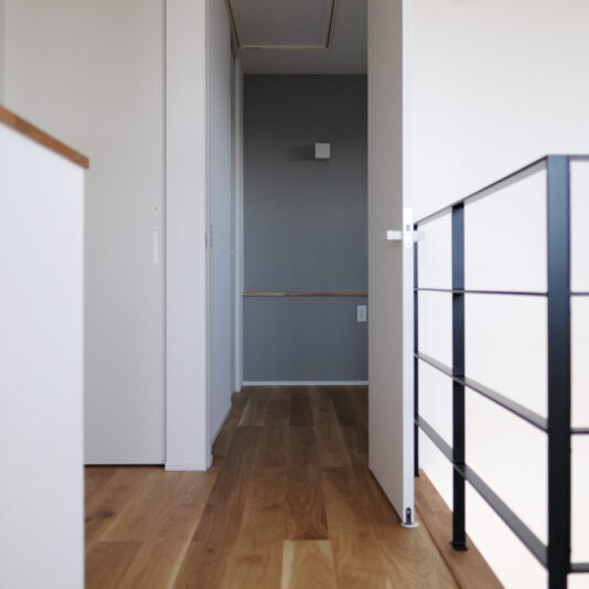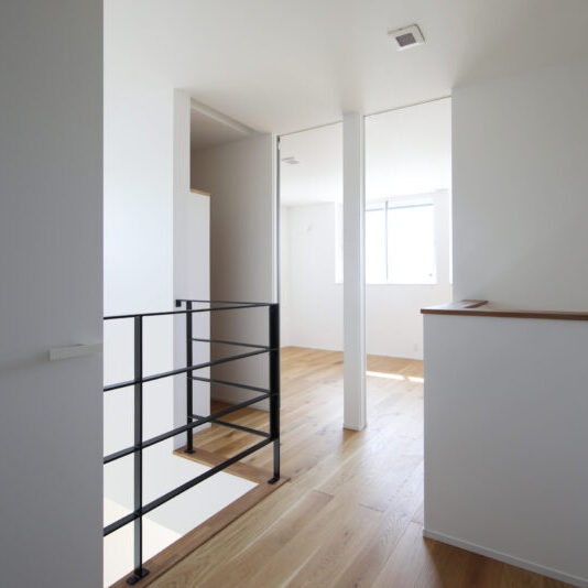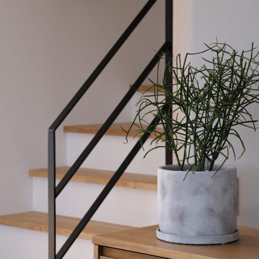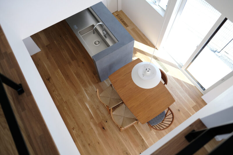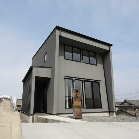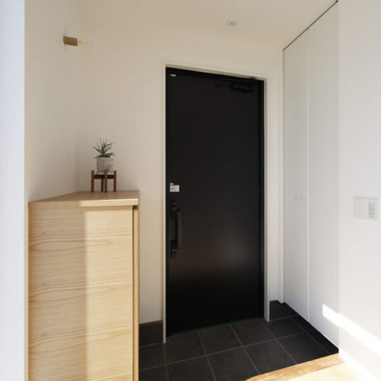 見晴らしの良い丘の上に佇むのは、吹き抜けから光が降りそそぐ家。 どんなインテリアも馴染むシンプルなデザインでありながら、 アクセントカラーのブラックが、ささやかに全体の印象を締めてくれます。