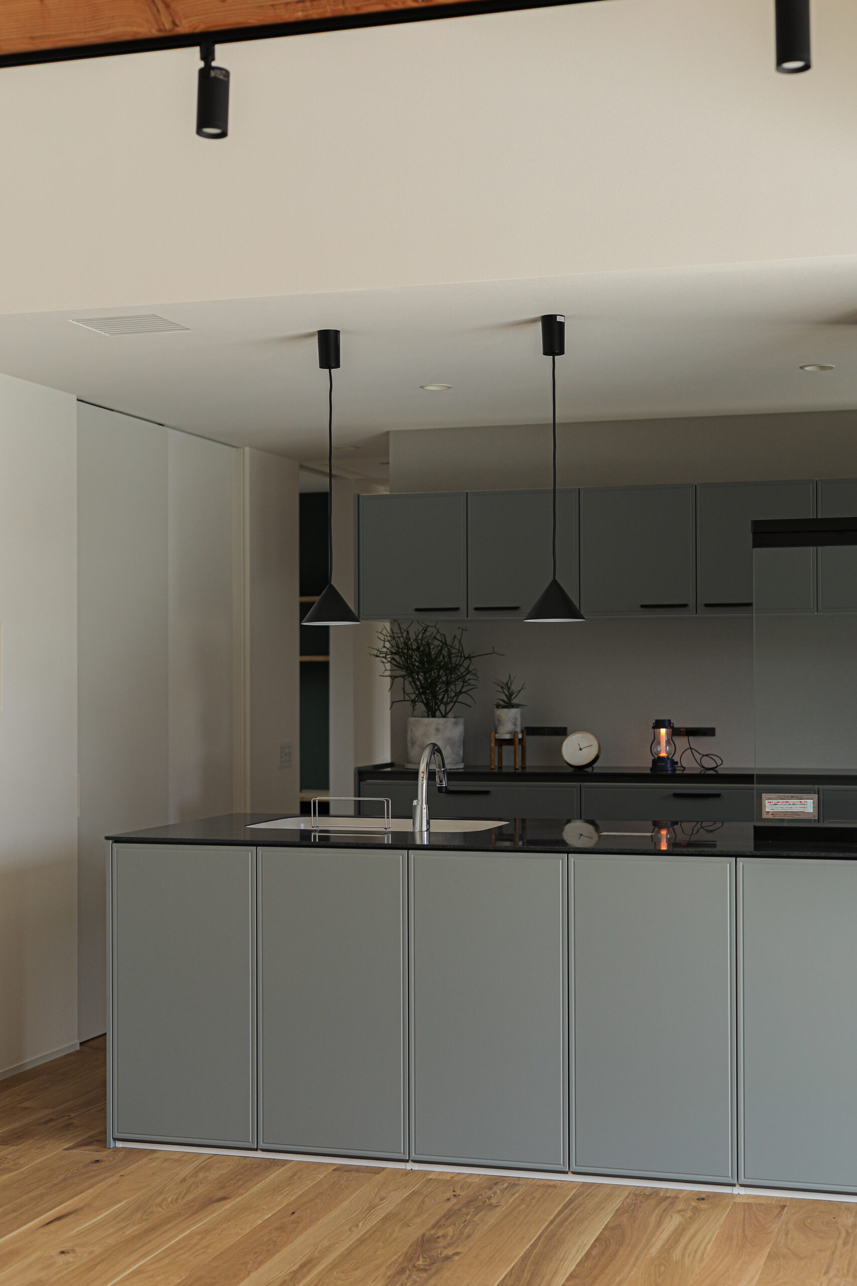 グリーンを家全体の差し色に。 好きな色を沢山使いたい、だけど派手すぎない大人の色使い。 化粧梁から落ちるスポットが、落ち着きのあるLDKに華やかさを添えます。