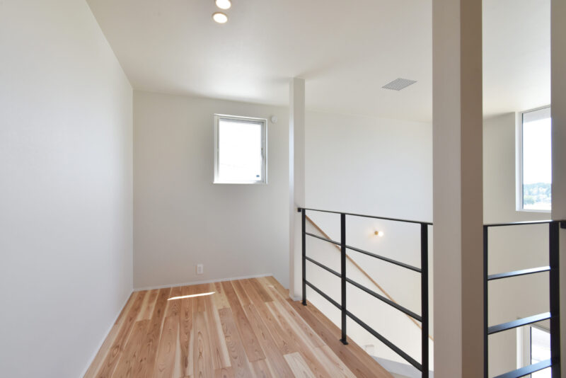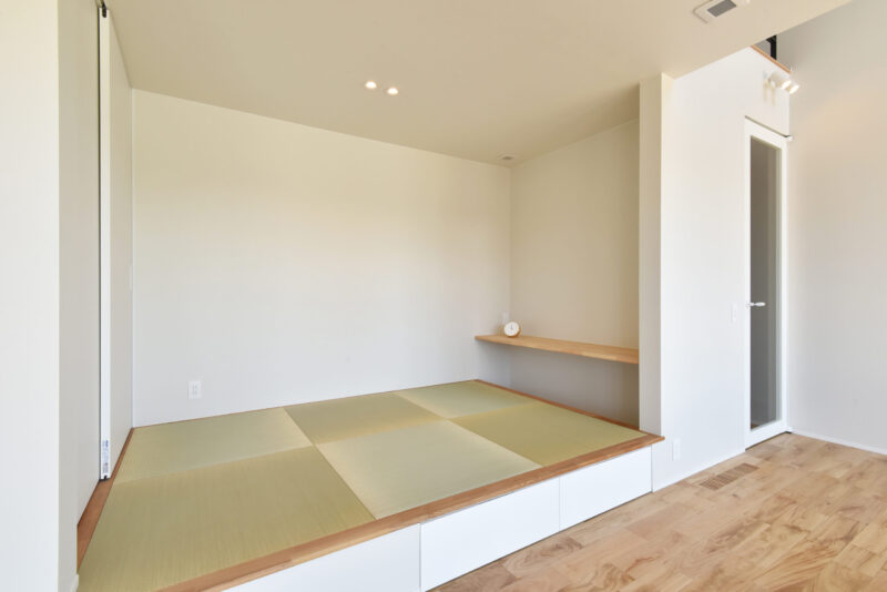 自然豊かな立地を活かし、2階のホールにある窓とリビングにある大きな窓からは外の景色がよく見え、 リビング横の和室でくつろぎながら自然を楽しむことができます。 寝室は小上がりに設計され、壁にプロジェクターをうつし映画を鑑賞できます。