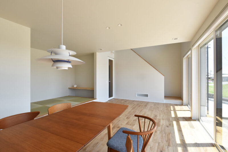 日差しが心地よい空間で過ごす、自由なお家時間。 食卓を囲んだり、和室でのんびり読書をしたり。 家族みんなが気ままに時間を過ごせる、32坪の平屋。