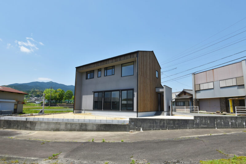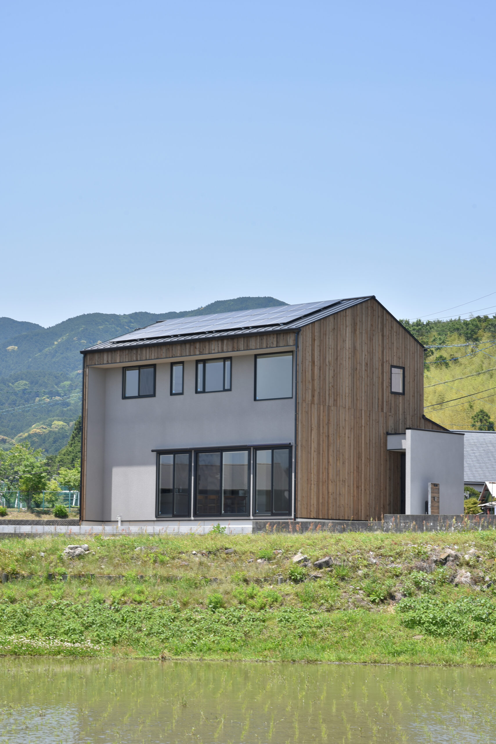 自然に馴染む板張りの二階建て。 大きくて開放的な窓から、田園風景を眺めながら憩いの時間を過ごす。 郊外ならではの穏やかな暮らしを育む、安らぎの家です。
