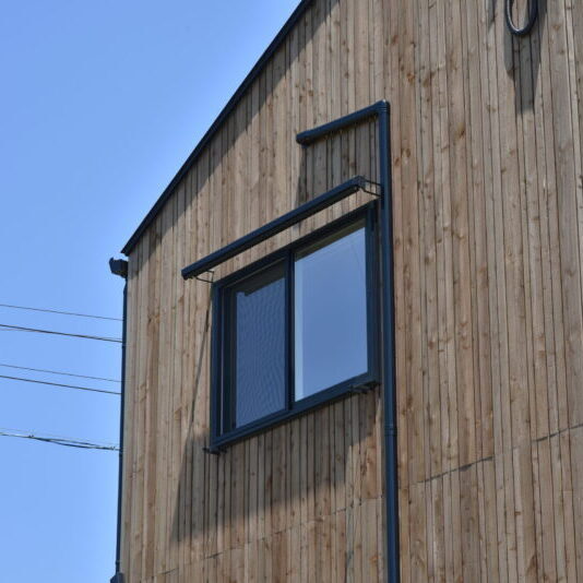 寒い冬でも猫とフローリングでゴロンとくつろぐ、温もりのある家。 時と共に変化していく板張りの外壁と、 まっさらなR垂れ壁の曲線が、どこか優しい印象を与えます。