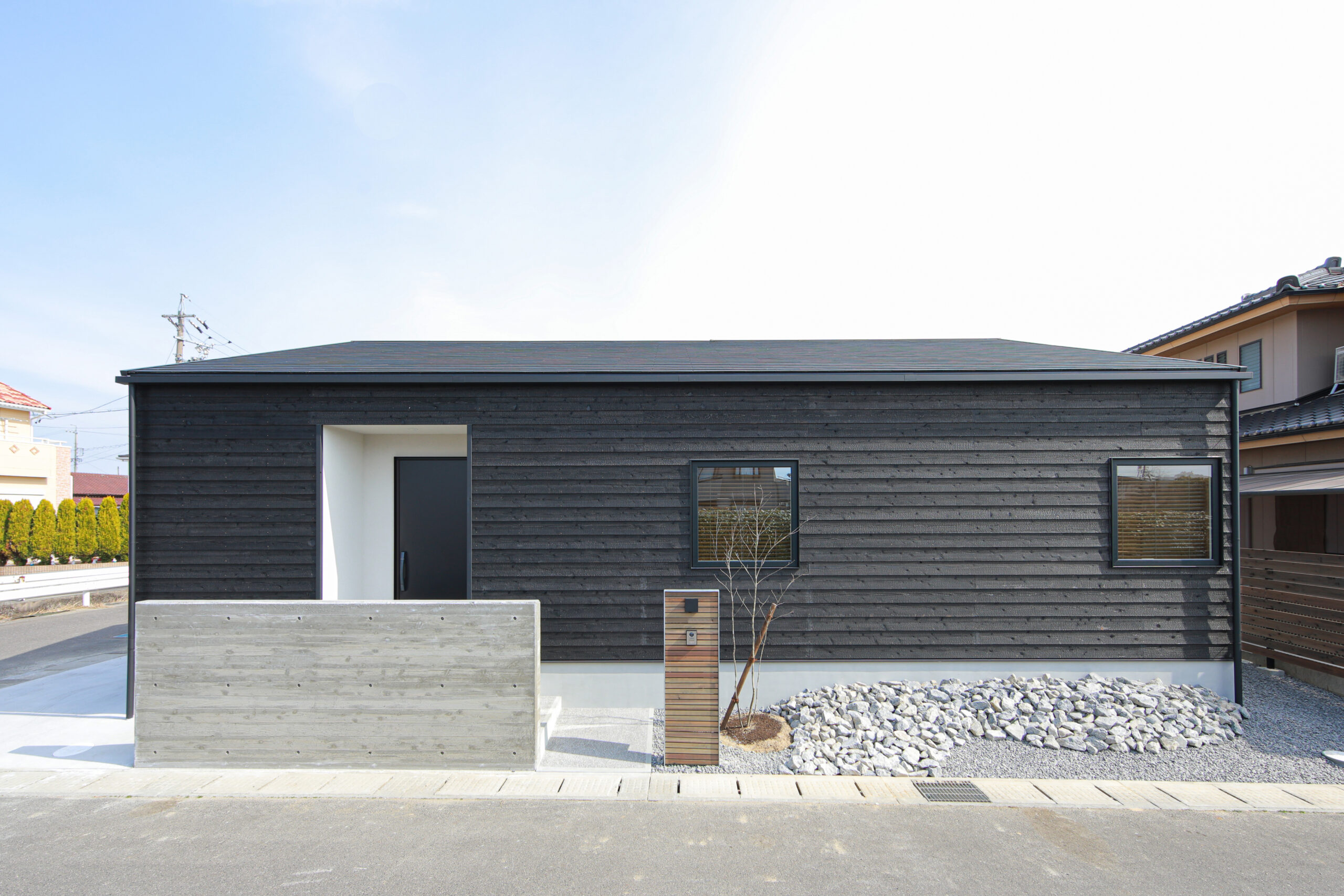 ブラックの焼杉を纏う平屋。 内装は、無垢材の香りが優しく包む北欧テイスト。 シナベニヤの勾配天井が空間を広く見せます。