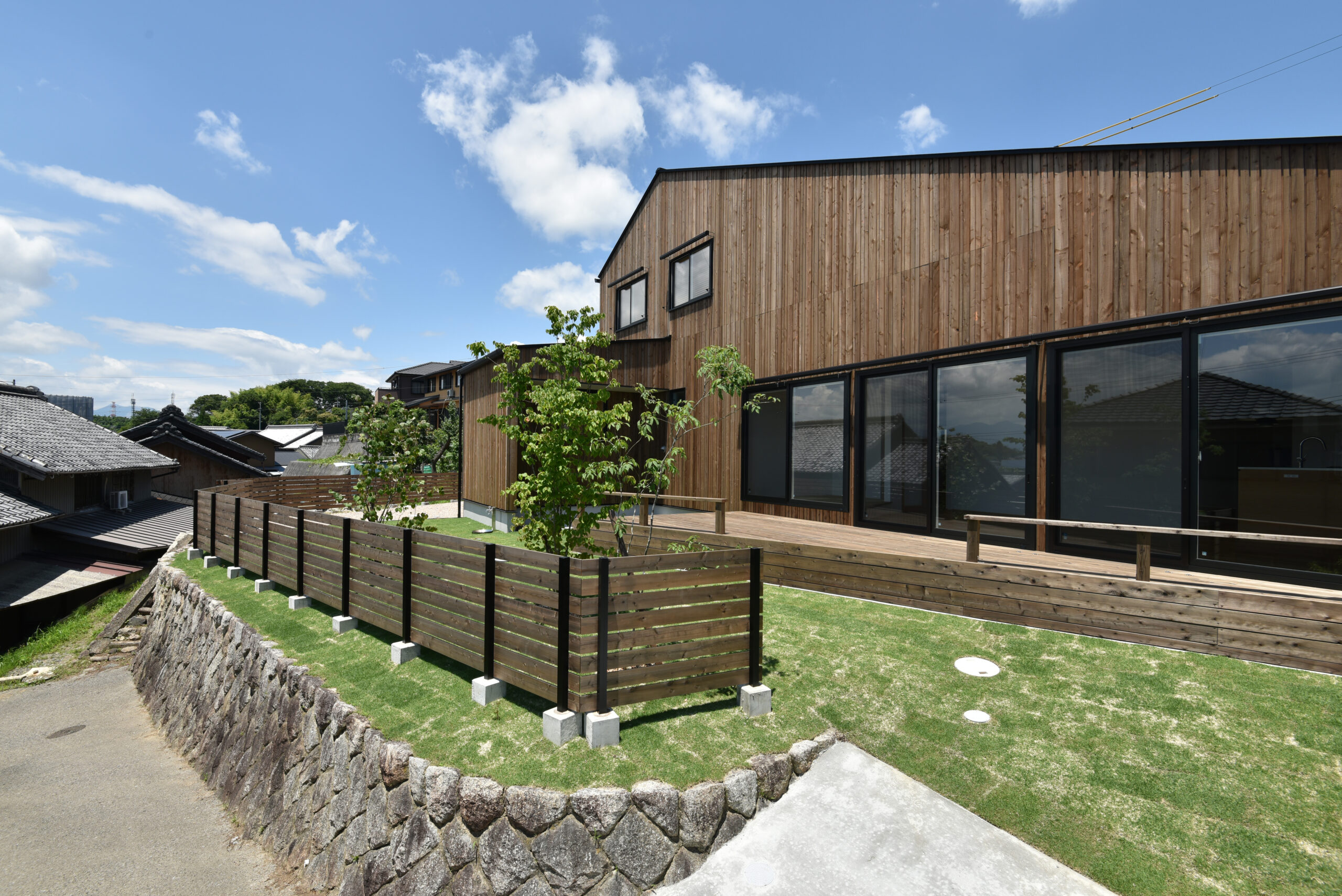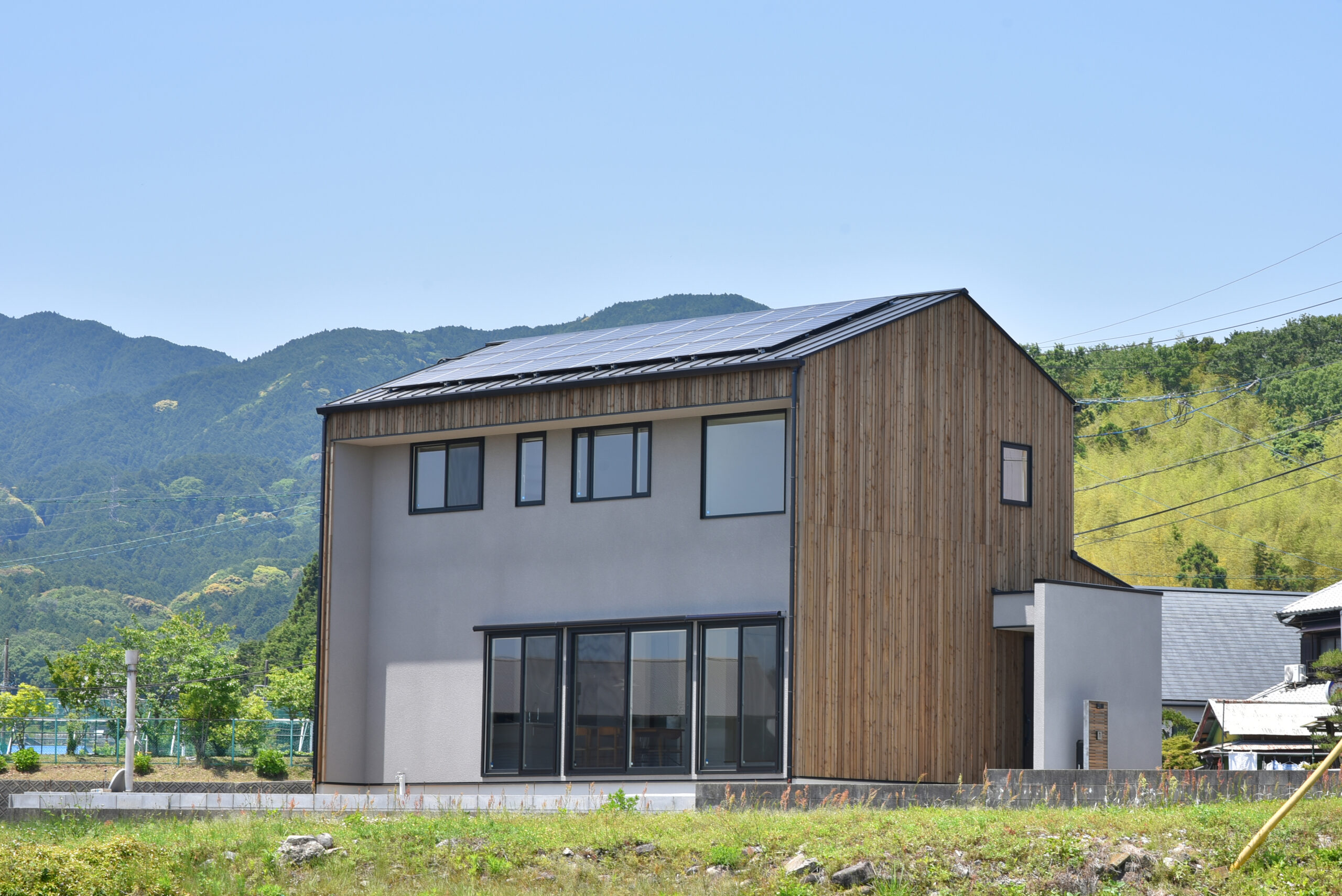 自然に馴染む板張りの二階建て。 大きくて開放的な窓から、田園風景を眺めながら憩いの時間を過ごす。 郊外ならではの穏やかな暮らしを育む、安らぎの家です。