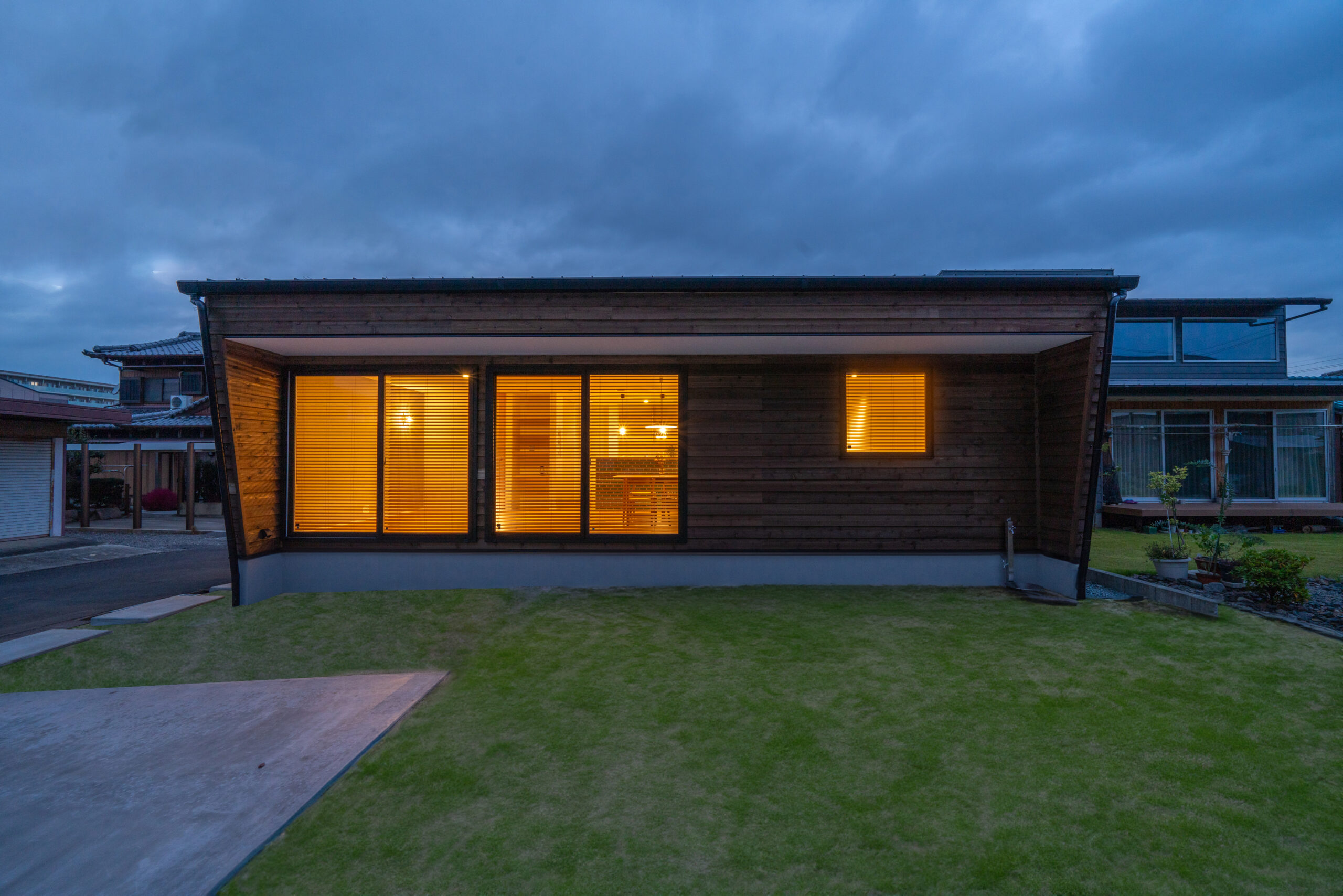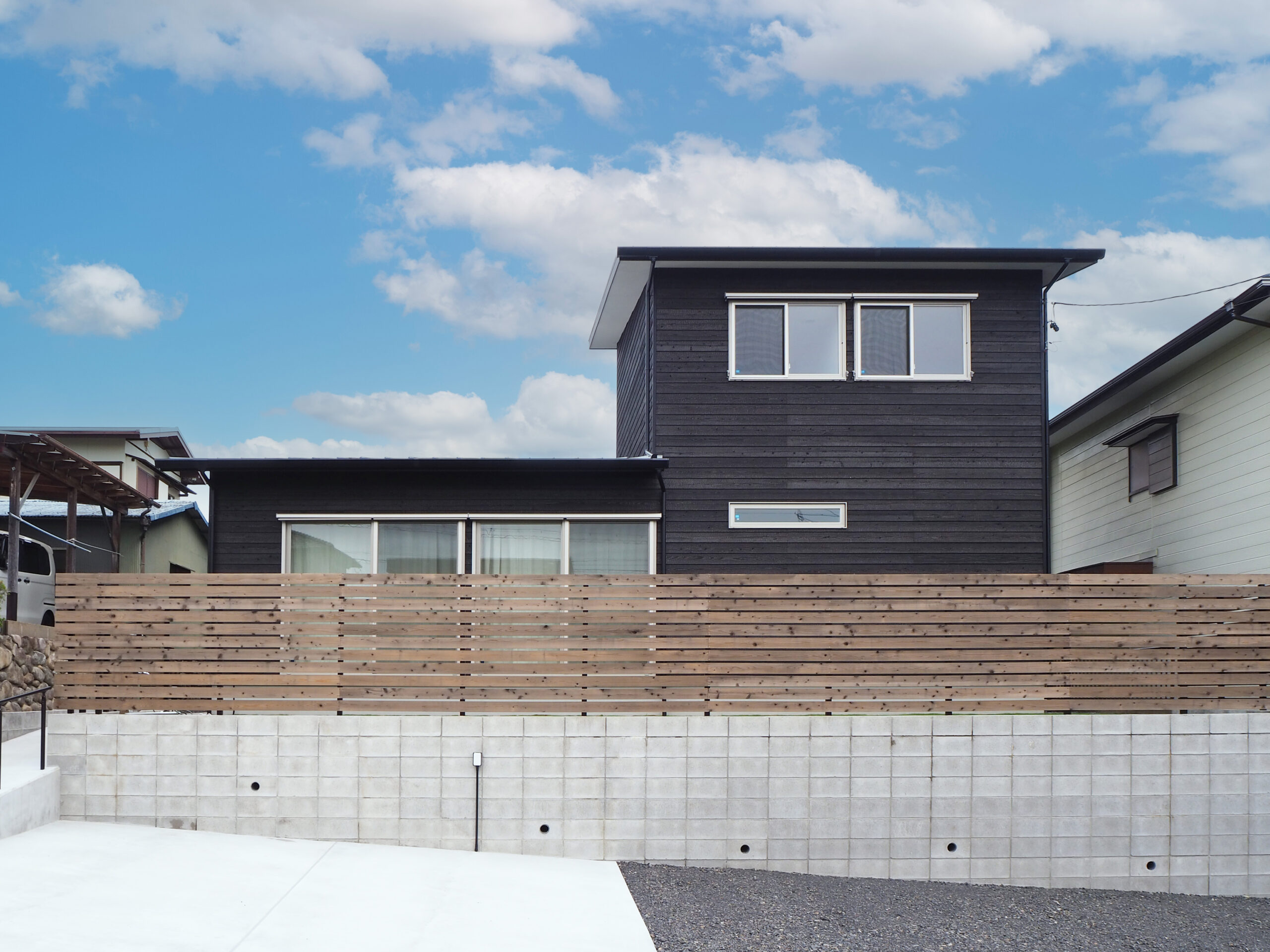 素焼き塗装の焼杉が、伝統的な日本家屋を思わせる。 経年と共に炭は少しずつ風化していき、 この家も家族と共に年を重ねていく。